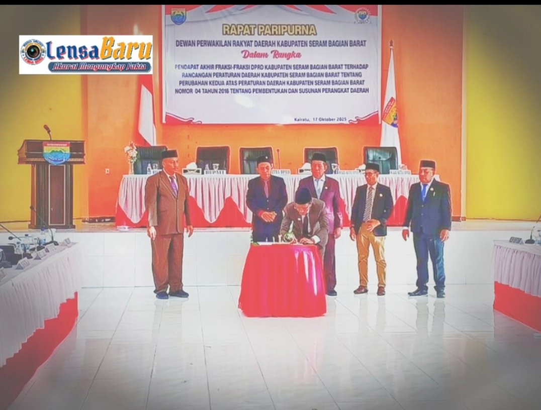 Lensa Baru.Com-Piru Seram Bagian Barat– Dewan Perwakilan Rakyat Daerah (DPRD) Kabupaten Seram Bagian Barat (SBB) menggelar rapat paripurna pendapat akhir fraksi-fraksi terhadap Rancangan Peraturan Daerah (Ranperda) Kabupaten SBB tentang Perubahan Kedua atas Peraturan Daerah Nomor 04 Tahun 2016 tentang Pembentukan dan Susunan Perangkat Daerah, Jumat (17/10/2025).